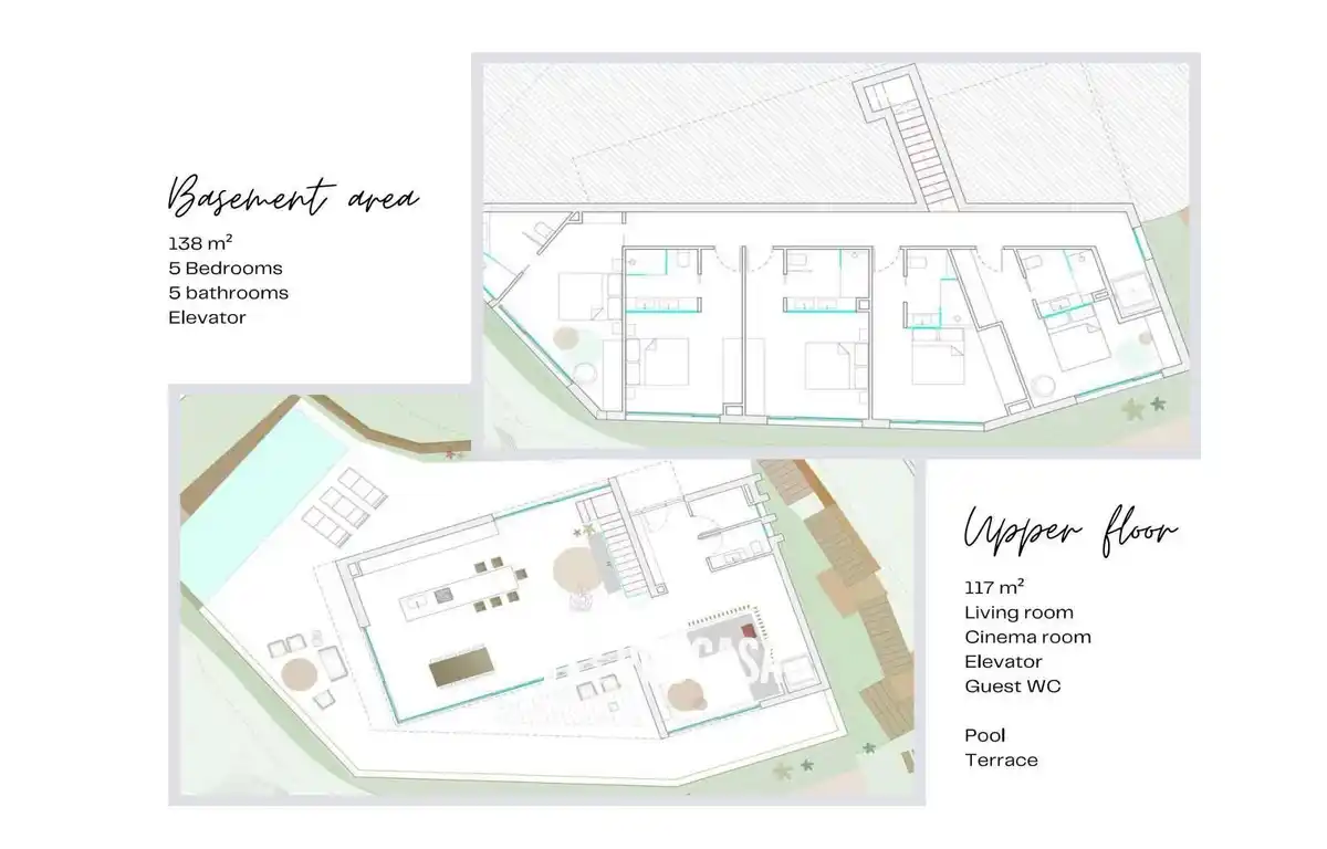 En venda aquest terreny únic, llest per construir una vila moderna i elegant amb vistes inigualables al mar. La vivenda combina disseny contemporani amb funcionalitat, integrant espais interiors i exteriors per crear una sensació d’amplitud i connexió amb la natura. Característiques principals de la vila: - 5 dormitoris i 5 banys - Superfície total construïda: 382,50 m² - Planta baixa: 165 m² - Planta pis: 137,95 m² + 28,55 m² porxos = 166,50 m² - Soterrani (garatge i espai flexible): 51 m² - Piscina privada: 24,45 m² - Terrasses de 120 m² - Saló principal, sala de cinema i lavabo de cortesia - Ascensor que connecta totes les plantes - Garatge: 51 m² Una oportunitat única per a qui busca construir una residència exclusiva en un entorn privilegiat, amb projecte i llicència d’obra ja aprovats.