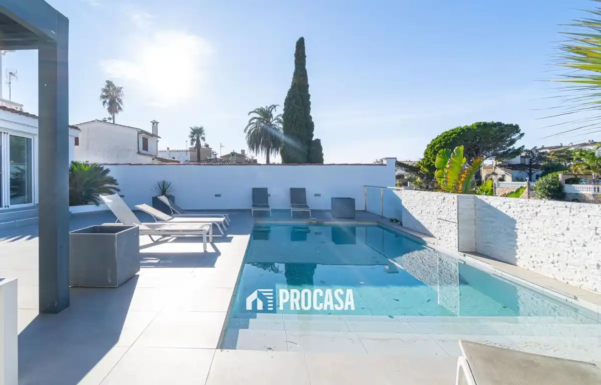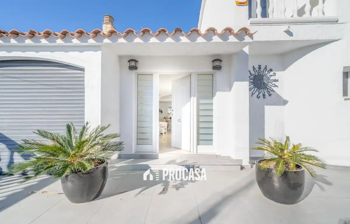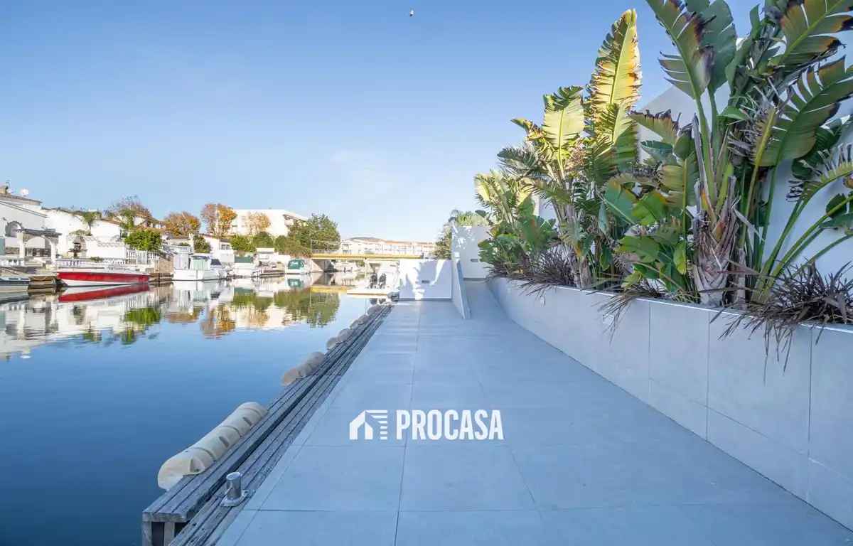 Situada en una parcela de 500 m² junto al canal ancho, esta vivienda renovada dispone de un amarre de 12,5 metros y unos exteriores actualizados en 2017. La propiedad se divide en dos zonas independientes, lo que ofrece flexibilidad para familias grandes o para recibir invitados. En la planta baja, el garaje comunica directamente con la vivienda. Aquí se encuentra la cocina, el salón-comedor con salida a la terraza, así como cuatro dormitorios y cuatro baños, dos de ellos con baño propio. La primera planta, con entrada independiente desde el lateral, cuenta con cuatro dormitorios y dos baños, además de una terraza con vistas al canal. En el exterior, hay una piscina, una zona de estar bajo pérgola y una cocina de verano, creando un espacio práctico y agradable. Extras: chimenea, ventiladores, aire acondicionado frío/calor, ventanas de PVC con doble acristalamiento y armarios empotrados.